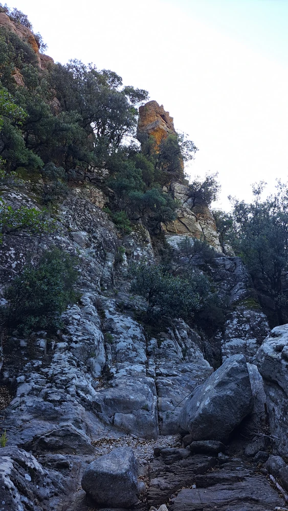 Accès : Après avoir laissé votre voiture au parking des Gorges de Colombières, vous progresser en direction du torrent, prenez l'escalier tailler dans la roche. Au bout du cheminement béton, vous traversez le torrent via le muret, si ça déborde du muret, renoncez à votre séance :). En face, vous retrouvez un sentier très joueur, qui vous permet de traverser de nouveau le torrent et de retrouver le tuyau noir. Dès que le tuyau noir disparait, vous surveillez la paroi sur l'autre rive pour trouver le gendarme en photo. À ce niveau, vous passez en face, redescendez quelques mètres par la droite, le départ est au pied de la rampe.