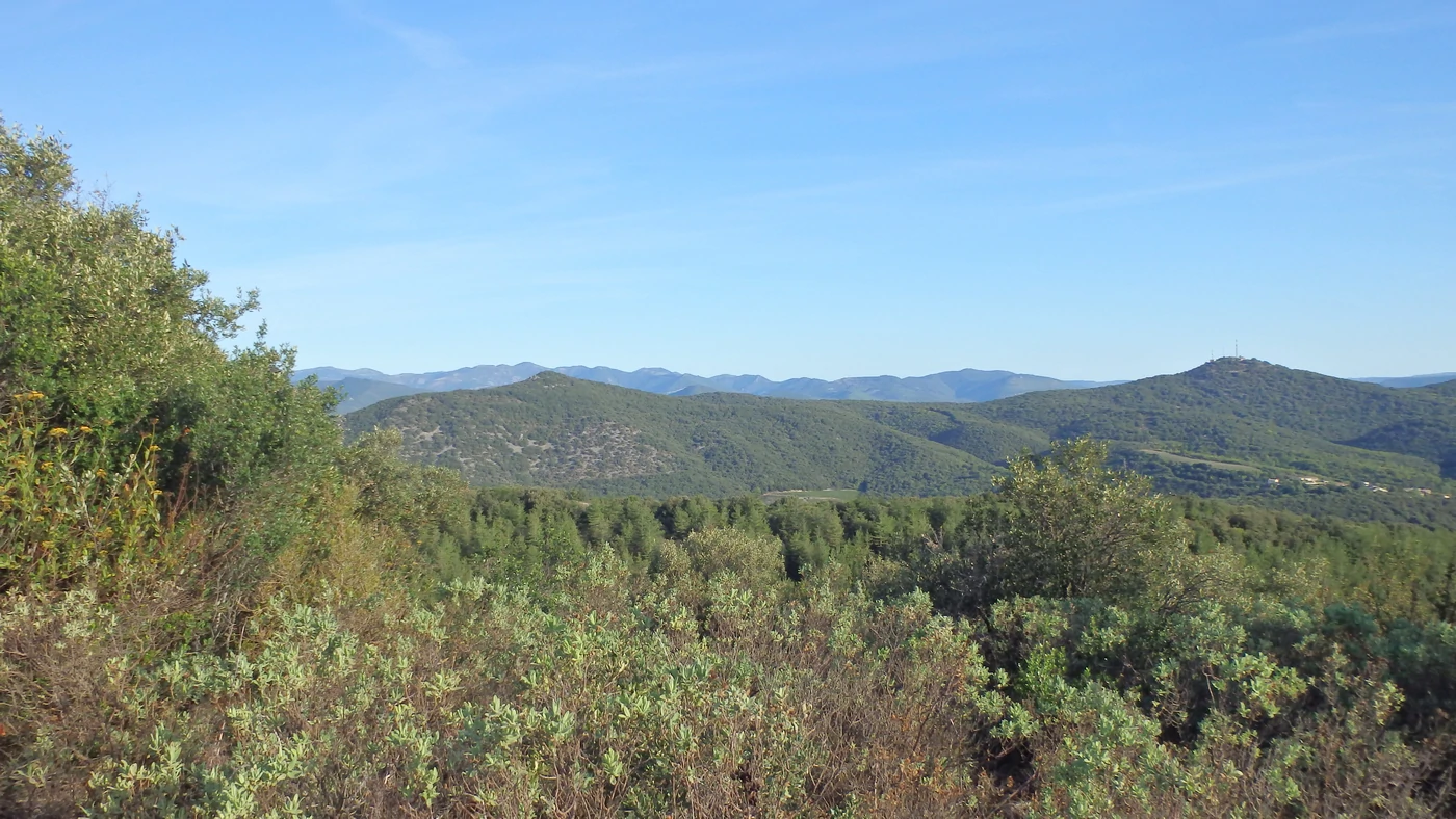 À la départementale attention, vous devez traverser en direction des mates basses, ça circule beaucoup. Après le passage au caveau, vous rejoignez le balisage officiel. Après les mates basses que vous pouvez parcourir (https://www.parc-haut-languedoc.fr/actualites/une-oeuvre-dart-au-domaine-des-mates-basses) vous pouvez envisager une coupe la cote 312 sur IGN pour éviter une large boucle sur piste inintéressante. Après les antennes, vous entamez une descente vers Caussiniojouls.
