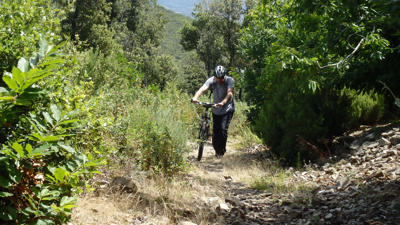Passé le ruisseau, une zone de portage plus ou moins franche jusqu'à Cauduro avec une vue magnifique. Là, vous traversez le village de gîtes et vous voilà d'abord en descente puis en traversée (un peu vertigineuse) à contourner le rocher des Baumelles. Après ça, piste et descente finale sur un sentier parfait pour le VTT.