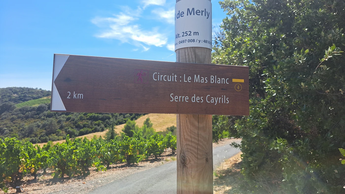 Du centre de Berlou, vous prenez la route de La Treille et passer en plein centre du village, rapidement après les dernières maisons, le balisage jaune vous propose une rude montée vers le hameau de la Mausse. Après le hameau, vous progressez entre les parcelles de vignes plus ou moins à l'ombre. Au col Merly vous traversez la route d'Escagnès. À ce niveau, vous prenez soit la route goudronnée, soit le balisage officiel qui traverse une parcelle, mais qui risque de gratter les jambes un peu plus loin. Dans la descente, ne pas manquer le tourne à droite très discret qui vous ramène vers Berlou par plusieurs sections mono-trace de bonne facture.